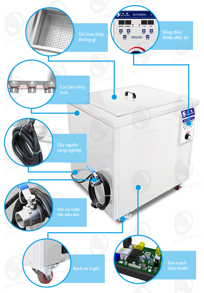 Bể rửa siêu âm công nghiêp JP-120ST dung tích 38l, được tích hợp bảng điều khiển điện tử, nút bấm nẩy, dễ dàng thao tác, có màn hình Led hiển thị số,chiết áp điều khiển tần số sóng 28KHz – 40KHz tương ứng công suất máy dao động 600W. Toàn bộ vỏ, giỏ đựng đều làm bằng inox 304 không gỉ.