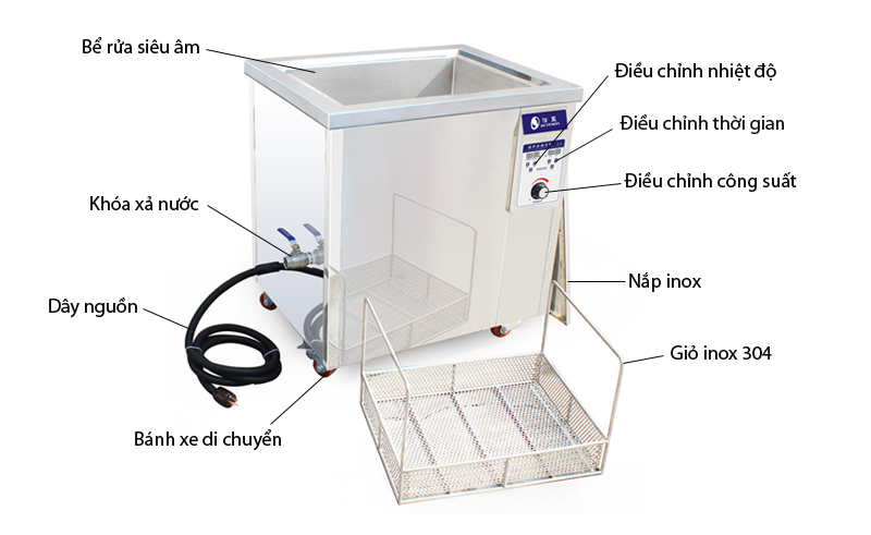 Khác với bể rửa siêu âm công nghiêp JP-360ST 135L, JP-240ST không đi kèm với máy tạo tần số sóng siêu âm ngoài, tòa bộ bộ phận nằm bên trong máy. Thiết kế JP-240ST chắc chắn, kiểu dáng công nghiệp cả về khay & bể rửa siêu âm. Ở cạnh bên phải máy đặt một quạt làm mát có lưới lọc bụi, 4 góc bao gồm 4 bánh xe chịu lực.