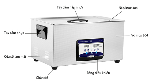 Thiết bị rửa siêu âm JP-080s sửa dụng bộ vỏ 100% bằng SUS304 không gỉ, sáng trắng cứng cáp, trọng lượng 12,6kg tương ứng với dung tích bể 22l (Dung tích bể thực thấp hơn thực tế 22 lít, do bể tửa inox bên trong được uốn con, làm vát.
