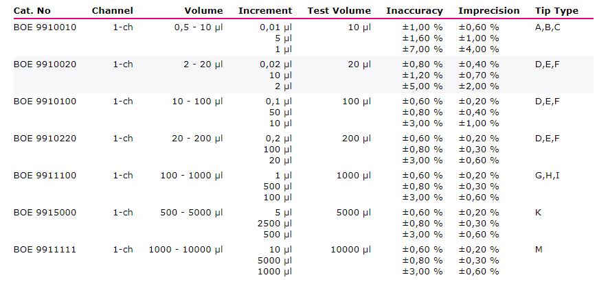 Micropipet BOE 9910010, BOE 9910020, BOE 9910100, BOE 9910220, BOE 9911100, BOE 9915000, BOE 9911111