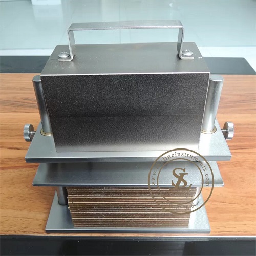 bao gồm một số tấm acrylic và có thể được giữ trong khung tải phù hợp.Khung tải bao gồm hai tấm thép, giữa đó đặt các tấm acrylic.Mẫu thử được khâu giữa các mảnh vải trắng thích hợp và nhúng vào dung dịch thử có tính kiềm hoặc axit.