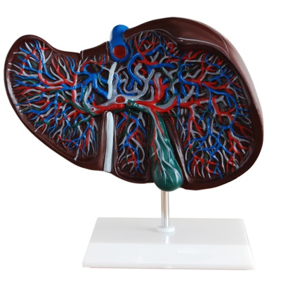 Mô hình này cho thấy các cấu trúc giải phẫu cơ bản của gan. Mạng lưới mạch máu phức tạp trong gan được hiển thị bằng các màu khác nhau trong mô hình gan: mạch máu rốn gan, ống dẫn mật ngoài gan và trong gan. Để đứng.