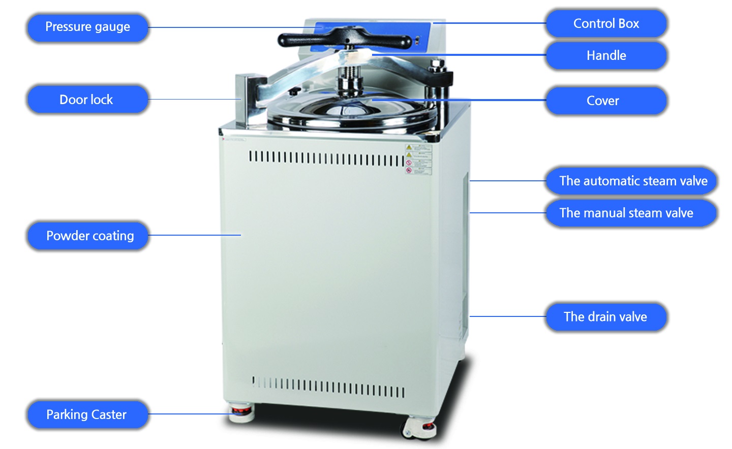 - Sau khi cài đặt thời gian và nhiệt độ, chỉ cấn bấm phim khởi động, quá trình sẽ tự động thực hiện: không khí bên trong bị đuổi ra ngoài. Sau quá trình hấp, đạt đến nhiệt độ tiệt trùng. Hơi nước và áp suất khí được xả. Âm thanh báo hiệu chu trình kết thúc.