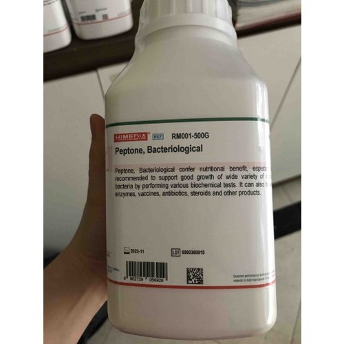 Nguyên tắc và diễn giải: Peptone, Bacteriological được điều chế bằng cách phân hủy thịt tươi được chọn bằng enzym. Có giá trị dinh dưỡng cao, nó hỗ trợ sự phát triển tốt của nhiều loại vi sinh vật và có thể được sử dụng để xác định vi khuẩn bằng cách thực hiện các xét nghiệm sinh hóa khác nhau